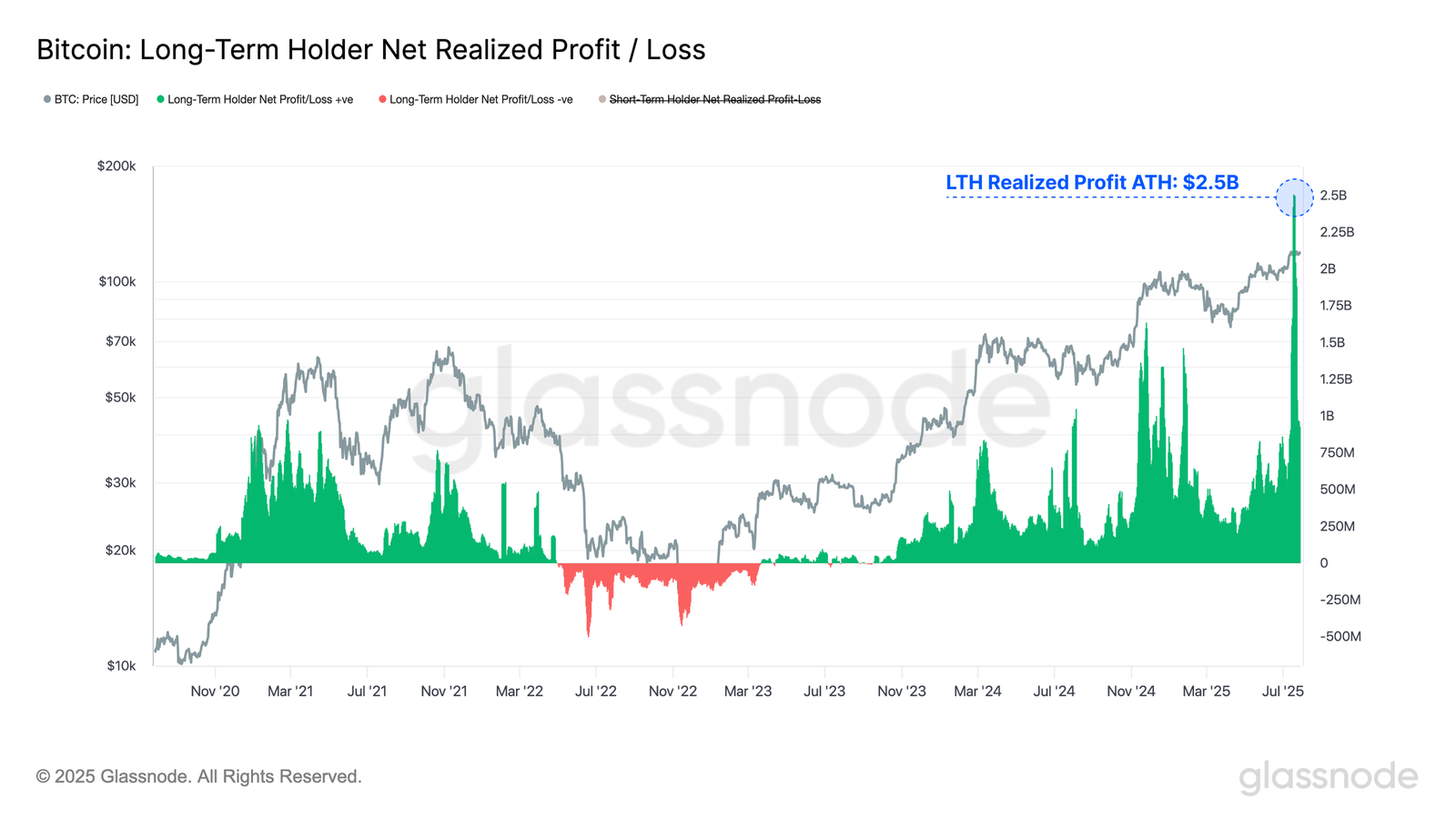 The Long-Term Holder Net Realized Profit/Loss metric climbed to $2.5 billion—surpassing the previous high of $1.6 billion. This marks the largest single sell-side pressure event in Bitcoin history. Even so, Bitcoin’s price response remained measured, stabilizing just below its all-time high.