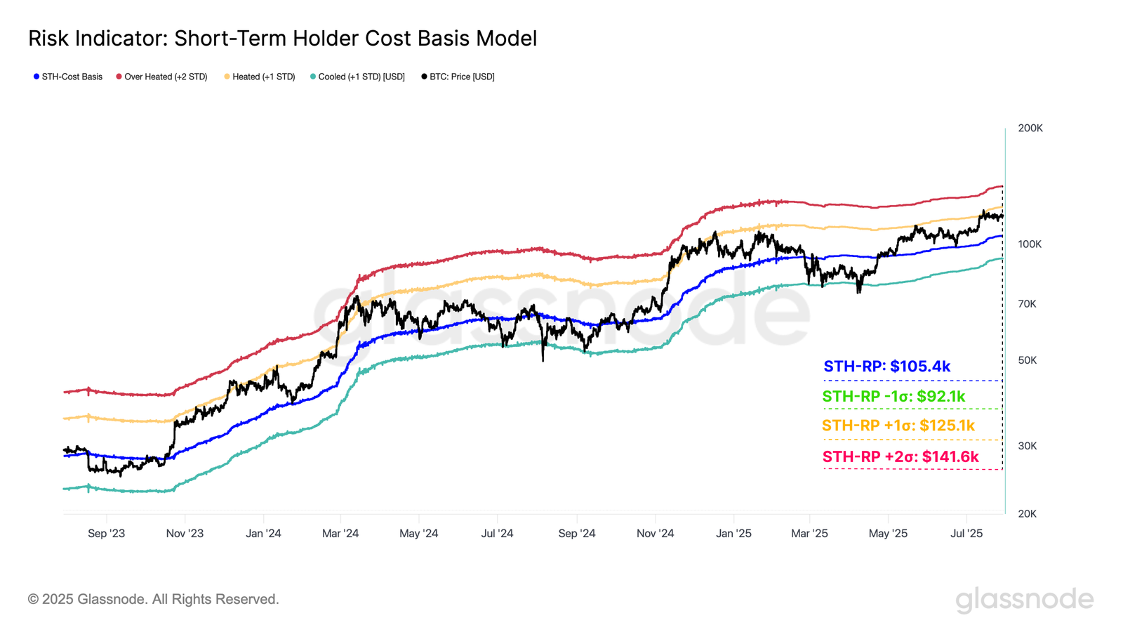 The Short-Term Holder (STH) Cost Basis remains a critical indicator of sentiment. Bitcoin is still trading above the STH average cost, suggesting bullish conditions. Standard deviation bands around this cost basis provide structure for identifying local tops or breakouts.