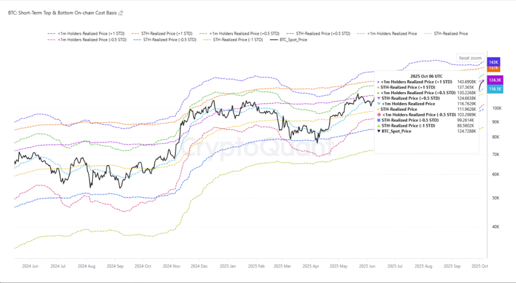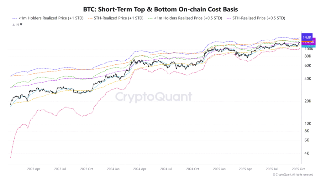 The STH realized price (+0.5 STD) of $133,239 marks a key resistance. Closely aligned is the STH realized price (+1 STD) at $131,310, with the <1m holder realized price (+1 STD) at $143,170 forming the upper boundary. Together, these create a critical band where traders may seek to secure gains.