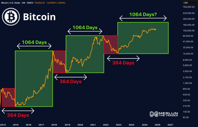 - Bitcoin’s historical 1064/364-day pattern fades as liquidity and capital flow accelerate market rhythm beyond halving cycles.