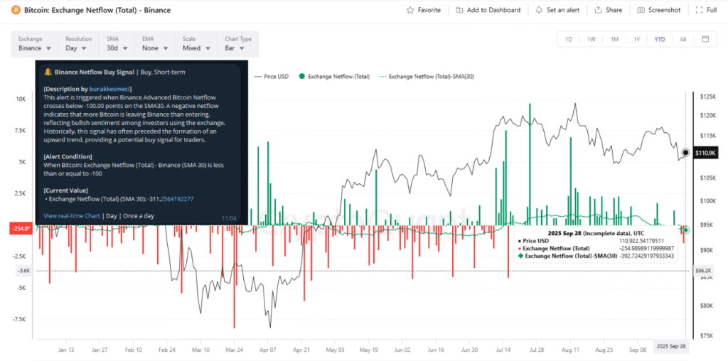On-chain activity adds further weight to the bullish case. Analyst Burak Kesmeci reported that Binance Bitcoin Netflow (SMA30) dropped to -311 BTC, signaling strong outflows from the exchange.