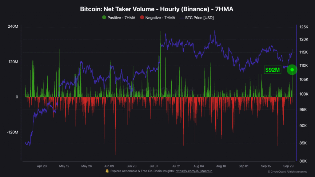 Darkfost reported that taker buy volume, a measure of aggressive futures buying, spiked to $92 million on a 7-hour average. This marked the sharpest and most sudden increase since August, signaling heightened speculative demand for Bitcoin derivatives.