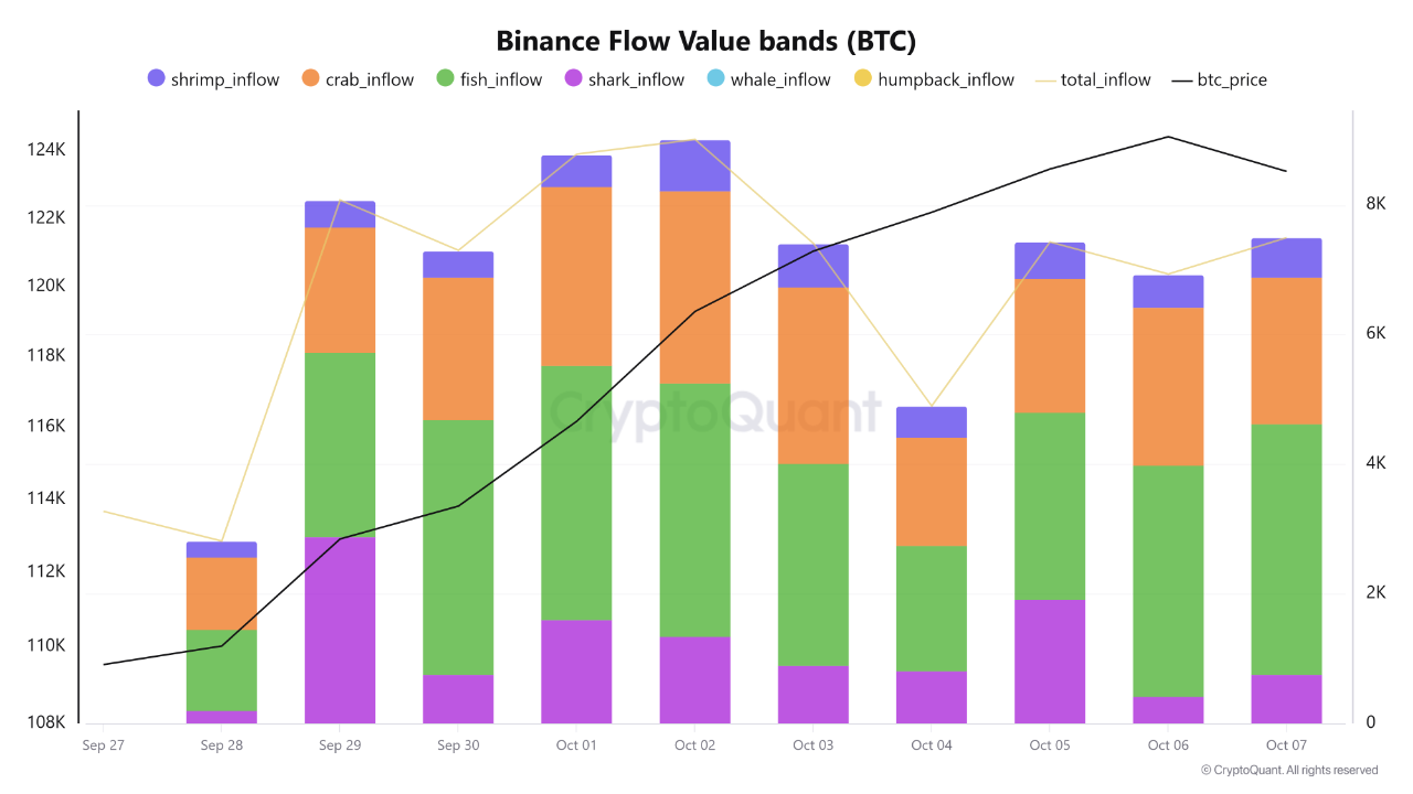 An analysis of Bitcoin inflows by wallet size provides further clarity on the market dynamics. Data showed that smaller wallet cohorts were primarily responsible for the selling activity during the correction phase. On October 7, inflows consisted of 603 BTC from “shrimps,” 2,260 BTC from “crabs,” 3,860 BTC from “fish,” and 768 BTC from “sharks.”