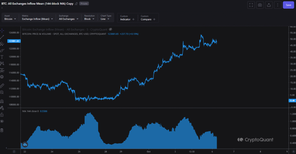 - Bitcoin exchange inflows decreased along with the price increase of 108K to 124K as traders chose to keep their coins rather than sell them.
