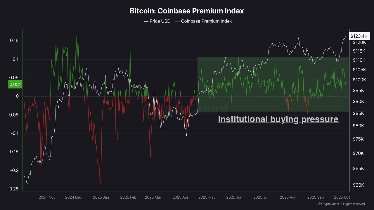 Institutional involvement remains a key feature of the current rally. Market analyst Darkfost noted that professional investors and whales continue accumulating Bitcoin, a trend visible through the Coinbase Premium Index.