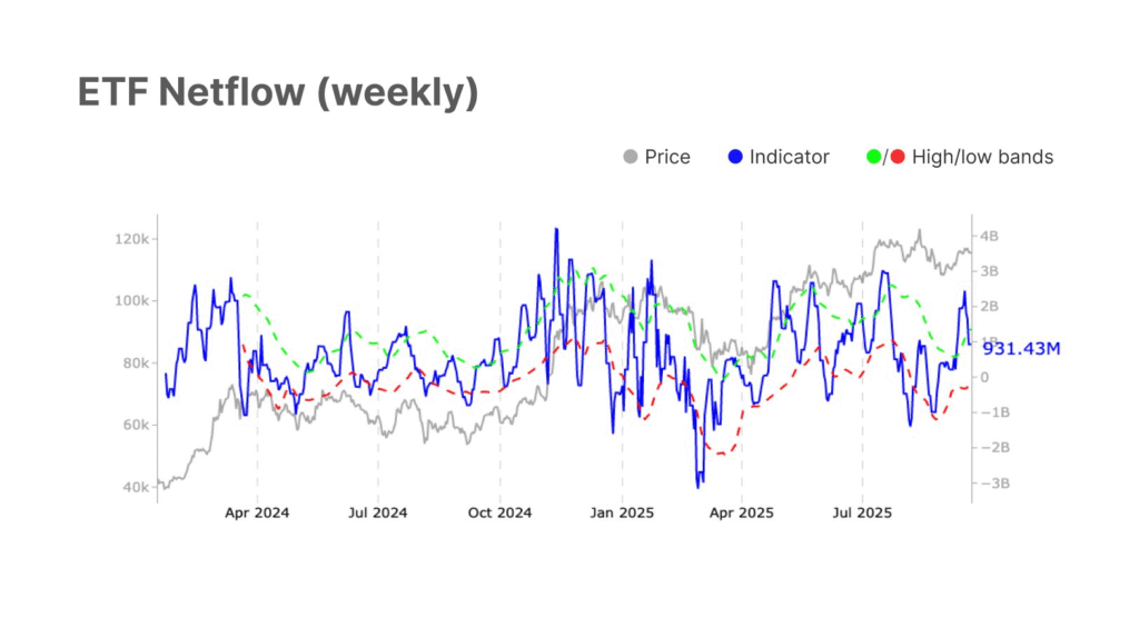 Glassnode also observed a slowdown in U.S. spot Bitcoin ETF flows. Net inflows dropped notably after a strong prior streak, while trading volumes remained steady. The moderation suggested tempered institutional demand, hinting at a pause in accumulation by traditional finance participants.