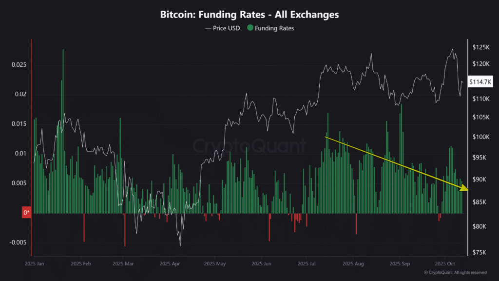 The Bitcoin Estimated Leverage Ratio (ELR) also fell after matching its highest level since 2022. The drop in ELR shows traders are using less leverage as a whole, which is common with resets in structure. Such conditions typically mark the start of more sustainable trading behavior across derivatives platforms.