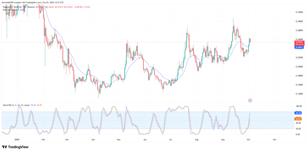 According to daily chart, Dogecoin has reclaimed the 20-day EMA at $0.2462 after rebounding from the $0.22 support.The rebound propelled price to $0.26 before minor selling pressure cut gains back to $0.2555. This shows momentum is still intact despite short-term losses.