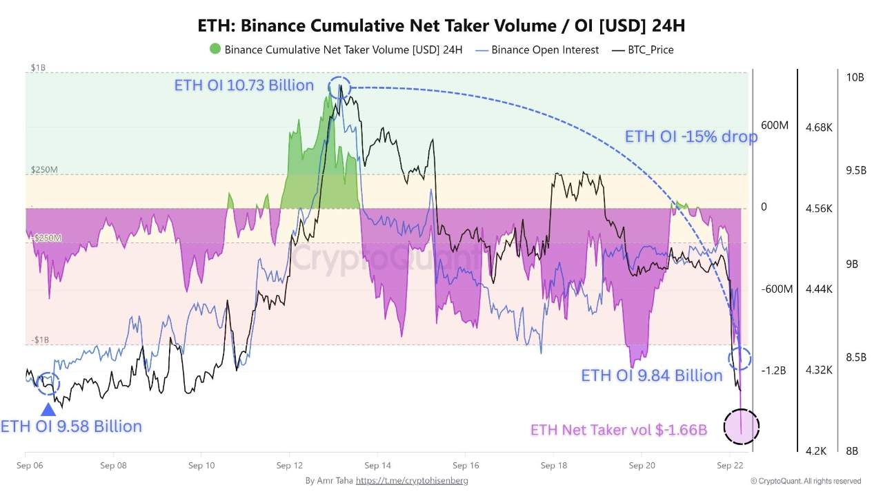 Ethereum futures positioning shifted lower as open interest on Binance fell to $9.84 billion after the sharp pullback. The decline nearly matched the $9.58 billion mark seen on September 6, a level that previously acted as solid support for futures activity.
