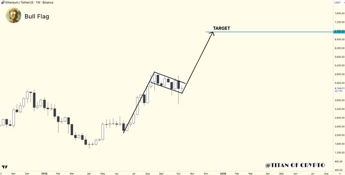 Analysts are comparing Ethereum’s current Bull Flag to Bitcoin’s 2020 breakout pattern. Titan of Crypto highlighted that the weekly structure “remains valid” and noted that a breakout could push ETH toward $6,700.