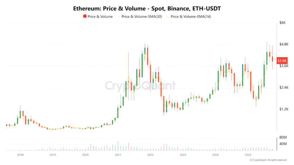 ETH is lurking around $3,800, nearing a critical resistance zone at $4,500 – $4,800. This resistance zone aligns with a previous local top, as well a significant psychological level for traders. Traders are cognizant that sustained momentum above this zone may lead to a run towards the $5,500 – $5,800 zone.
