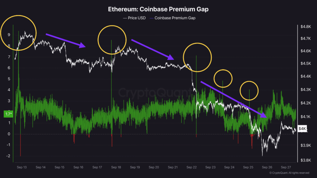 Ethereum’s Coinbase Premium, which compares the price between Coinbase and Binance, recently shifted into positive territory. A positive reading often suggests stronger buying pressure on Coinbase. Despite this, Ethereum’s price continued to slip, showing that Binance selling outweighed Coinbase demand.