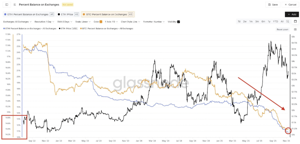 Glassnode data shows a steady drop in exchange balances for both Bitcoin and Ethereum. Bitcoin’s share slipped from about 16% in mid-2023 to 12%, while Ethereum’s fell from roughly 19% to under 13% by late 2025.