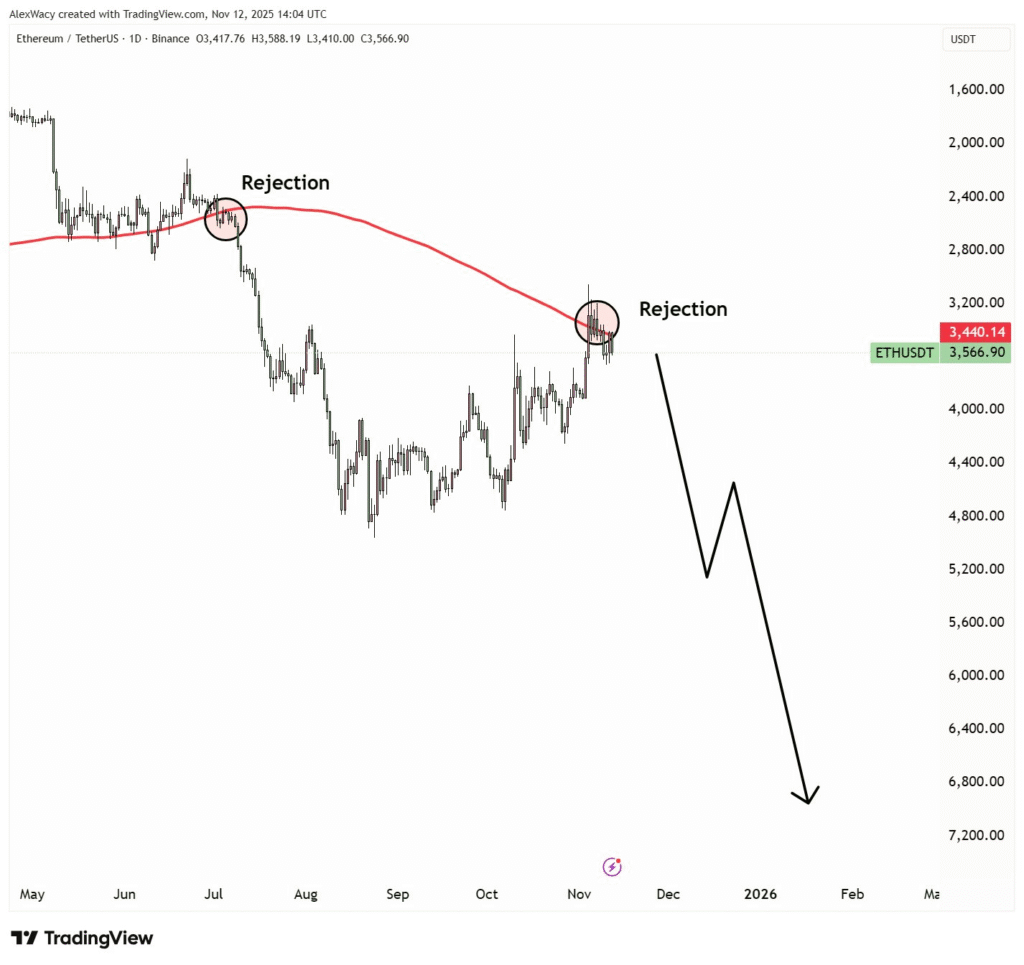 Analysts indicate that failure to break above this moving average can trigger renewed downtrends. The black arrow on daily charts suggests potential declines toward support zones below $3,000 if selling pressure intensifies.