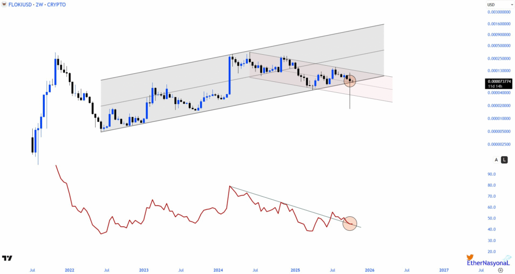 On the 2-week chart, FLOKI is at an essential support level, creating a double support that affirms the token’s continued increase. Technical indicators imply that this structure may restrict downside risk and preserve bullish momentum.