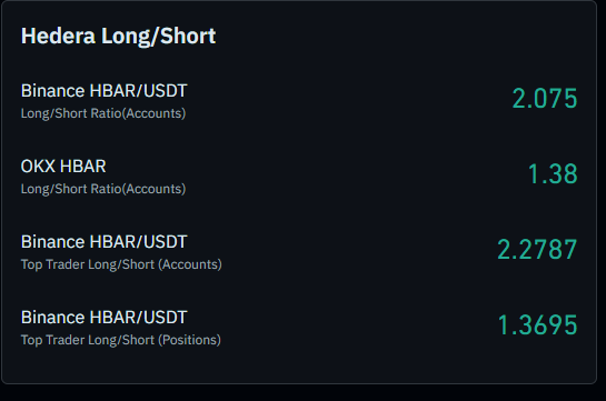 Trader positioning on leading exchanges reflects a bullish stance toward Hedera. On Binance, long-to-short ratios range between 2.07 and 2.27, showing strong conviction on the long side. OKX reports a ratio of 1.38, suggesting moderate optimism, while top trader allocations remain supportive at 1.36 and above.