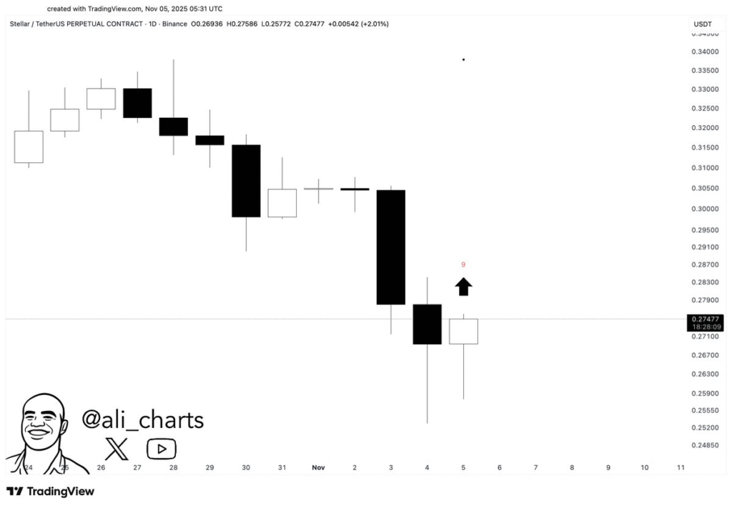 Supporting this structural outlook, trader Ali reported that the TD Sequential indicator flashed a buy signal for XLM. Historically, these signals have aligned with local market bottoms, potentially marking the beginning of the next upward move.