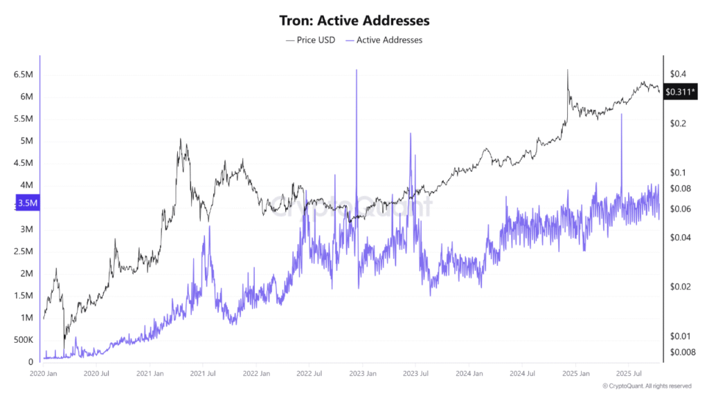 Between the beginning of 2020 and the last quarter of 2025, Tron’s network grew from a few hundred thousand actively used addresses to a projected 3.5 million. In that time, TRX itself also rose from $0.01 to approximately $0.311, and this indicates that user adoption has remained closely in line with price performance. This trend shows that the continued expansion of a Tron’s ecosystem will remain a value proposition in the long term.