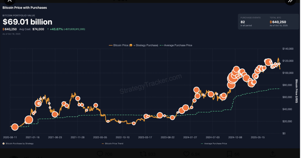 Recently, Saylor posted on X a chart from the Saylor Bitcoin Tracker displaying Strategy’s cumulative Bitcoin purchases. The chart showed the firm holding 640,250 BTC valued at around $69 billion at current prices. Saylor captioned the post, “The most important orange dot is always the next,” which many interpreted as a signal of another purchase.