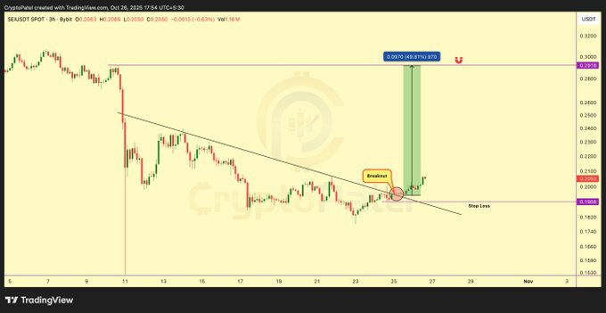 The structure shows Sei forming a higher low before breaking resistance — a classical reversal signal suggesting that selling momentum has weakened. A retest of the $0.20 level would serve as a healthy confirmation if buyers defend it as new support. Such behavior commonly validates a transition from bearish to bullish structure in early recovery phases.