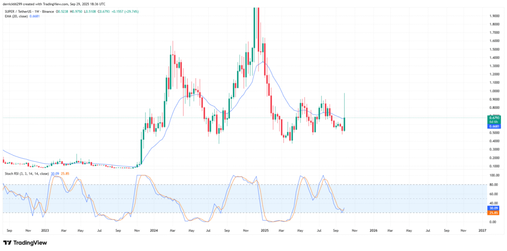 The broader structure reflects a transition from the 2022 downtrend into a developing accumulation phase. SUPER has repeatedly held support near $0.50, building a base that has attracted buyers during recent pullbacks.