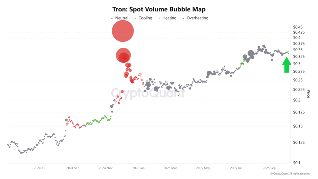 Data from the Tron Spot Volume Bubble Map shows that spot activity has entered a cooling phase. This decline in trading intensity suggests that selling pressure could be nearing exhaustion — a condition often seen near local market bottoms. Historical data indicates that such cool-down phases for Tron have frequently preceded strong upward reversals.