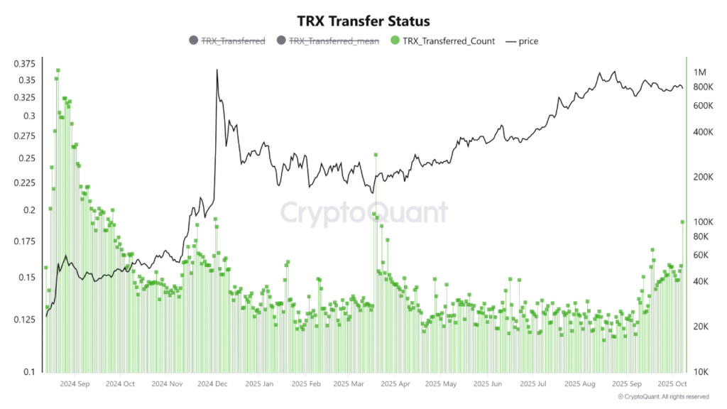 Despite reduced spot trading, TRON’s blockchain data paints a different picture. Crazzyblockk highlighted that TRX transfer counts recently surged to one of their highest points in the past year, signaling renewed on-chain participation and a potential rise in liquidity.