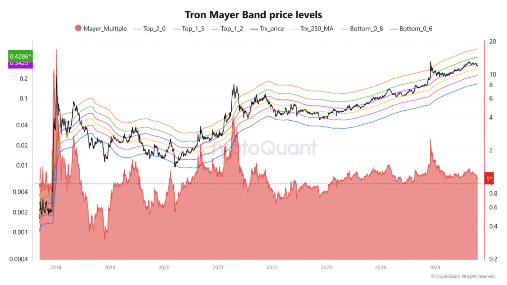 - The Mayer Multiple (MM 1.0) level remains the defining support zone, validating renewed bullish momentum and psychological assurance among TRX holders.