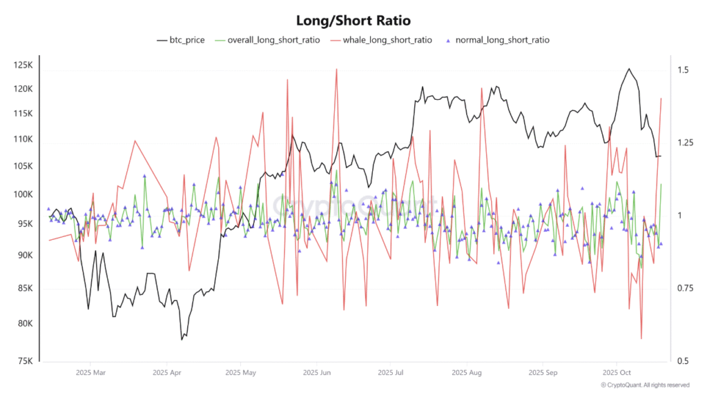 At the same time, smaller participants appear cautious. The “normal” trader long/short ratio stands at 0.91, showing more short exposure than long. This difference in positioning creates a liquidity transfer from weaker to stronger hands—an occurrence often observed before notable market advances.