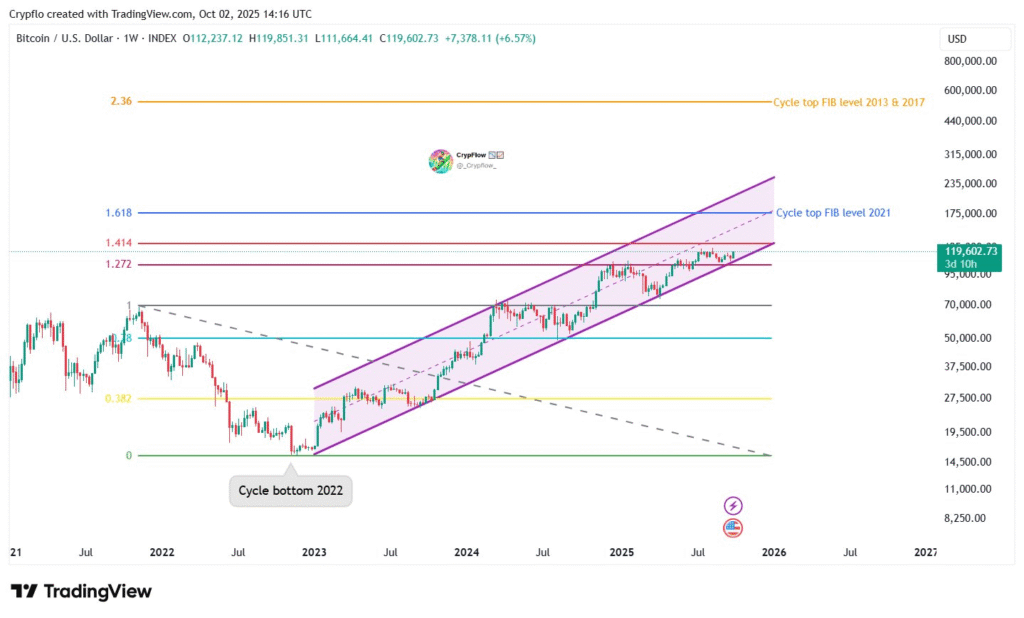 The Bitcoin 1W chart shows a steady structure of higher lows and consistent rebounds from the channel’s lower boundary. The asset is now trading close to $119,600, testing the 1.272 and 1.414 Fibonacci levels, which form a major resistance zone.