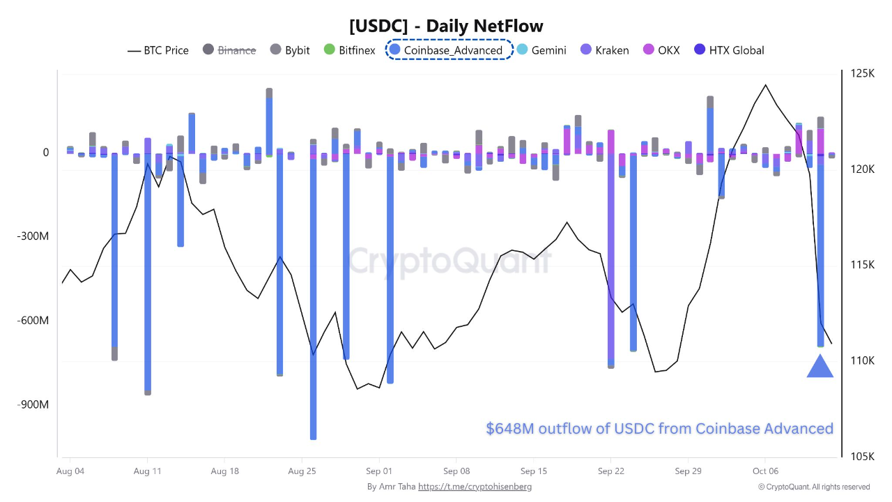 Alongside the renewed retail activity, stablecoin data reveals a different story. On October 11, Coinbase Advanced recorded a -648 million USDC outflow, marking a substantial drop in available buying power across exchanges. This decline in reserves suggests traders may have fewer stablecoins ready for immediate market entry.