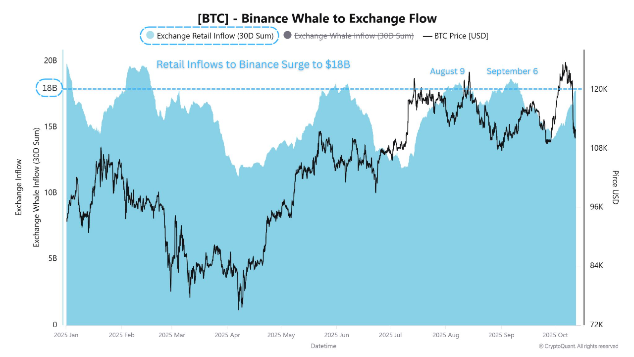 - Binance retail inflows surged to $18B, matching the same levels seen before Bitcoin’s August and September price corrections.