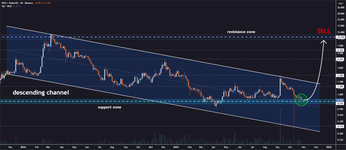 Analyst Jonathan Carter notes that WLD is once again testing the channel’s lower boundary—an area historically linked to accumulation. This range has acted as a floor multiple times, suggesting that buyers may be quietly building positions while volatility remains low.