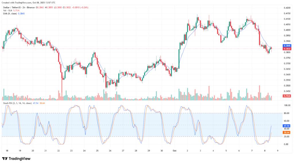 Looking closer, XLM has pulled back after reaching $0.4150 earlier this month. It dropped to around $0.3750 before bouncing a bit. The 9-period EMA at $0.3845 is just above the price and acting as resistance.